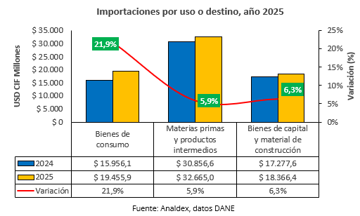 Analizando las importaciones por uso o destino económico, en el año 2025, las compras de materias primas y productos intermedios alcanzaron la cifra de USD CIF $32.665,0 millones, reportando un aumento de 5,9% respecto al año 2024. De este grupo los productos que contribuyeron en la mayor variación positiva fueron la compra de Productos alimenticios (15,7%), productos químicos y farmacéuticos (5,2%), Productos agropecuarios no alimenticios (16,8%) y productos mineros (7%).