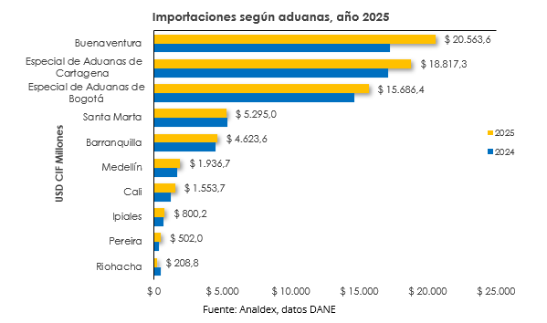 En la totalidad del año, Buenaventura fue la principal aduana de ingreso de las importaciones, al representar el 29,2% del total. Se evidenció un crecimiento de las compras al exterior por esta aduana de 19%, al pasar de USD CIF $17.285,9 millones a USD CIF $ 20.563,6 millones.