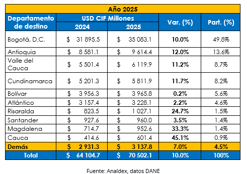 Durante el año 2025, la región desde la que se reportaron mayores compras externas fue Bogotá, al representar un 49,8% del total nacional, con una variación positiva de 10%, pasando de USD CIF $31.895,5 millones a USD CIF $ 35.083,1 millones.