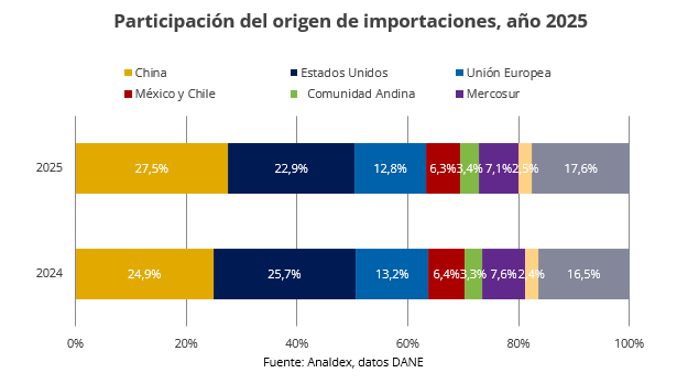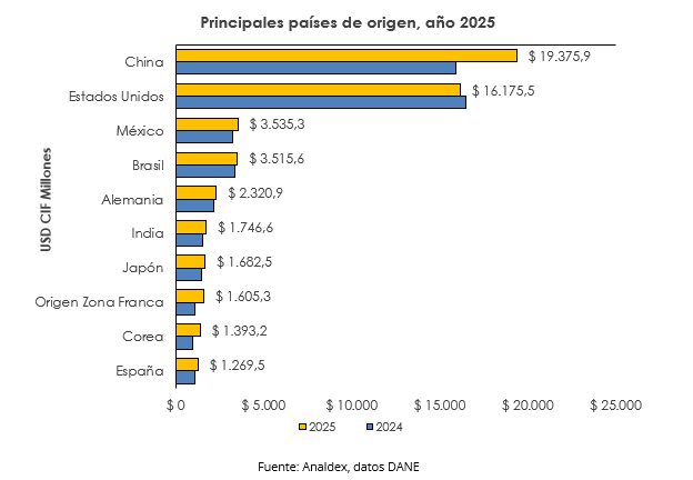 Al analizar los países de origen de los productos importados, para el año 2025, China sigue manteniendo el primer lugar con una participación de 27,48%, cerrando de esta manera el año como nuestro principal proveedor. Para este mismo periodo se registraron compras a este país por un valor de USD CIF $ 19.375,9 millones y una variación positiva de 21,6% respecto al periodo de referencia en el año 2024.