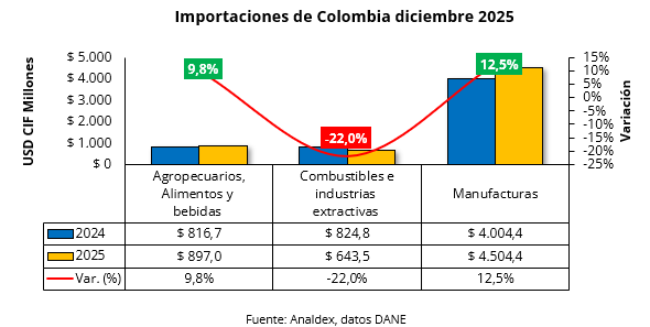 En el registro mensual correspondiente al mes de diciembre de 2025, las importaciones colombianas alcanzaron la cifra de USD CIF $ 6.050,7 millones, lo que representa un crecimiento en su valor del 7,1% frente al nivel del mismo mes del año anterior. Por su parte, el peso importado decreció un 0,5%, ubicándose en 3,8 millones de toneladas métricas, explicado por la disminución en el peso de Combustibles, aceites minerales y sus productos (-21,2%), Residuos industrias alimentarias. (-6,5%) y Cereales ( -3,7%).
