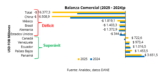Los países que generaron un mayor déficit comercial fueron: China con USD FOB -$ 16.508,9 millones, seguido por México con USD FOB -$1.819,1 millones, Brasil con USD FOB -$ 1.403,3 millones y Estados Unidos con USD FOB -$344,4 millones. Por el contrario, los países con los cuales se mantiene mayor superávit comercial son: Panamá con USD FOB $ 3.651,5 millones, seguido de Países Bajos con USD FOB $ 1.453,5 millones, y en tercer lugar Ecuador con USD FOB $ 1016,5 millones.