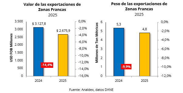 En el año 2025, se registró una disminución de 14,4% en el envío de mercancías al exterior desde zonas francas, pasando de USD FOB $3.127,8 millones en 2024 a USD FOB $2.675,9 millones en 2025. Durante el año 2025, el volumen total de exportaciones se redujo en un 9,9% respecto al 2024. En 2024 se exportaron 5,3 millones de toneladas métricas, mientras que en 2025 la cifra descendió a 4,8 millones de toneladas métricas.