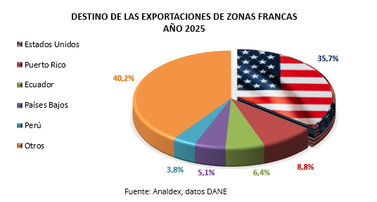 En el año 2025, Estados Unidos fue el principal socio comercial de las exportaciones del régimen franco colombiano. Este destino alcanzó un valor de USD FOB $955,1 millones, con un decrecimiento de 10,8% en comparación con el 2024. Así mismo, los demás socios comerciales principales fueron Puerto Rico con USD FOB $236,4 millones y un decrecimiento de 31,6%, y Ecuador con USD FOB $170,6 millones y una caída de 7,1%.