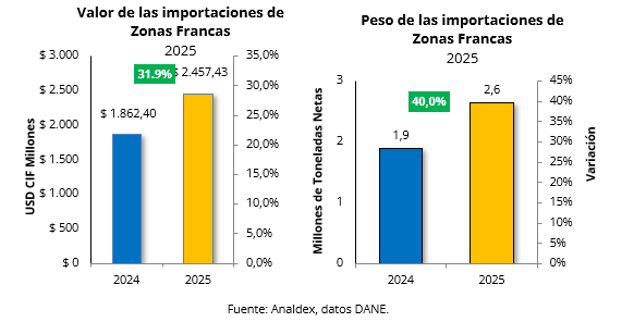 En el año, las importaciones de las Zonas Francas Permanentes Especiales (ZFPE) aumentaron 47,6% respecto al mismo periodo de 2024 y explicaron 19,3 puntos porcentuales del crecimiento total del régimen franco, con una participación del 45,3% en el valor total.