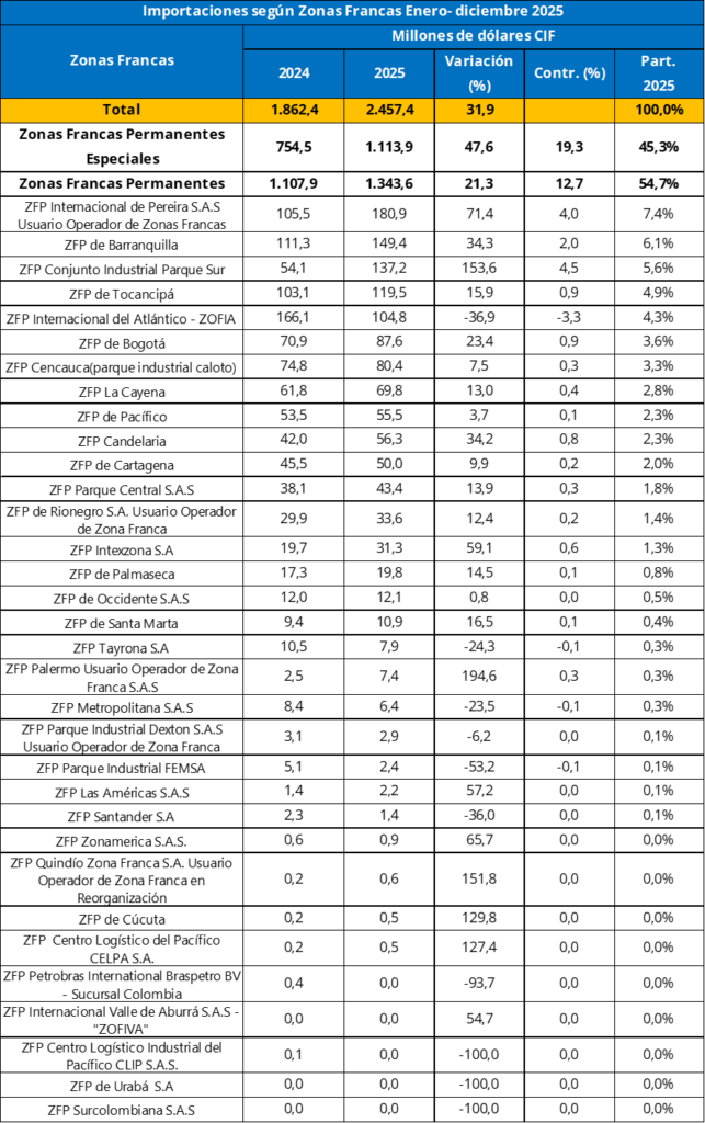 En el año las importaciones de las zonas francas alcanzaron un valor de USD CIF $2.457,43 millones, lo que representó una variación positiva de 31,9% respecto a lo registrado en el 2024, en el cual se presentaron compras externas por un valor de USD CIF $1.862,4 millones.