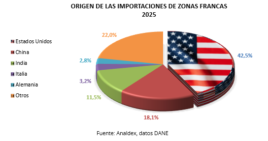 En 2025, Estados Unidos fue el principal origen de las importaciones de las zonas francas, con un valor de USD CIF $1.044,4 millones, presentando un crecimiento de 54,1% en comparación con 2024. En segundo lugar, se encuentra China, con un valor importado de USD CIF $444,7 millones y un crecimiento de 25,4%. Otro de los principales orígenes de compras al exterior es India, que registra un crecimiento de 78,3%, y cuyas importaciones alcanzan la cifra de USD CIF $283,5 millones.
