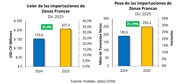 En diciembre de 2025, las importaciones de las zonas francas evidenciaron una variación positiva de 35,0%, al pasar de USD CIF $153,6 millones en diciembre del 2024 a USD CIF $207,4 millones en el mismo mes de 2025. Por otro lado, el volumen de importaciones aumentó en un 31,2%, al pasar de 190,6 mil toneladas métricas en diciembre de 2024 a 250,2 mil toneladas métricas en diciembre de 2025.