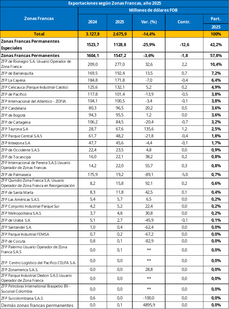 Las Zonas Francas Permanentes con mayores exportaciones en el año, en primer lugar, se ubicó la ZFP Rionegro con un crecimiento del 32,6% y ventas externas por USD FOB $277,0 millones en 2025 respecto a USD FOB $209,0 millones en 2024. En segundo lugar, se ubicó la ZFP Barranquilla con USD FOB $192,4 millones, evidenciando un aumento de 13,5%. En tercer lugar, se ubicó la ZFP La Cayena, la cual registró una variación negativa de 7,0%, pasando de USD FOB $184,8 millones en 2024 a USD FOB $171,8 millones en 2025.