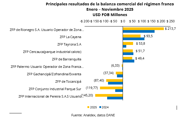 Por zonas francas, la ZFP Rionegro con USD FOB $245,6 millones presentó el mayor superávit comercial, seguido de ZFP La Cayena, ZFP Tayrona S.A., ZFP Cencauca y ZFP de Barranquilla S.A. Por otro lado, la ZFP Internacional de Pereira, la ZFP Conjunto Industrial Parque Sur, la ZFP de Tocancipá, la ZFP Gachancipá (ZOFRANDINA) y la ZFP Palermo son las que registraron mayor déficit.