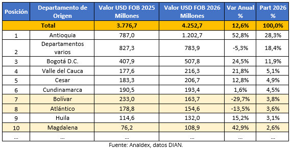 En enero de 2026, Bolívar se ubicó en la posición 7 entre los departamentos exportadores del país, con ventas externas por USD FOB $163,7 millones, lo que representó 3,8% del total nacional. Por su parte, Atlántico ocupó la posición 8, con exportaciones por USD FOB $154,6 millones y una participación de 3,6%, mientras que Huila se situó en la posición 9, con USD FOB $132,0 millones, equivalentes a 3,1% del total de Colombia. Finalmente, Magdalena se ubicó en la posición 10, con ventas externas por USD FOB $108,9 millones, lo que representó 2,6% del total nacional.