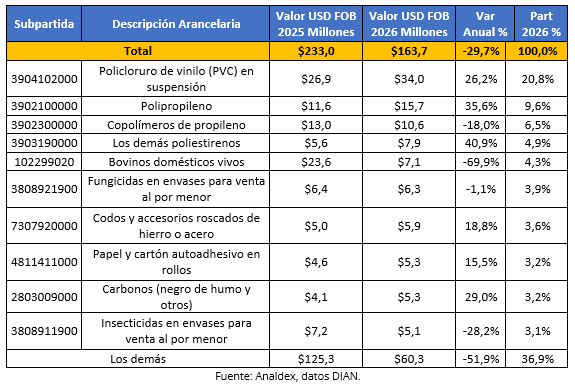 Entre los principales productos que contribuyeron a este decrecimiento se destacan bovinos domésticos vivos, que concentraron 4,3% del total y registraron una caída de 69,9%, seguidos por insecticidas en envases, con una participación de 3,1% y una disminución de 28,2%, y copolímeros de propileno, que representaron 6,5% y cayeron 18,0%. Por otra parte, algunos productos registraron crecimientos, como polipropileno, con una participación de 9,6% y un aumento de 35,6%, policloruro de vinilo (PVC) (26,2%), poliestirenos (40,9%) y carbonos, que participaron con 3,2% y crecieron 29,0%.