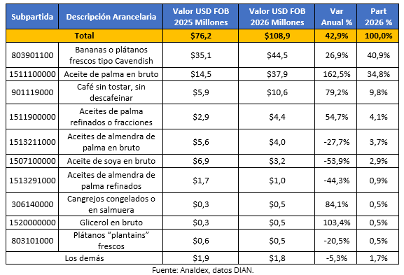 Entre los principales productos que contribuyeron a este crecimiento se destacan aceite de palma en bruto, que concentró 34,8% del total y registró un aumento de 162,5%, seguido por bananas o plátanos tipo cavendish, con una participación de 40,9% y un crecimiento de 26,9%, y café sin tostar, que representó 9,8% y creció 79,2%. Por otra parte, disminuyeron las exportaciones de aceite de soya en bruto (-53,9%), aceites de almendra de palma refinados (-44,3%) y aceites de almendra de palma en bruto (-27,7%).