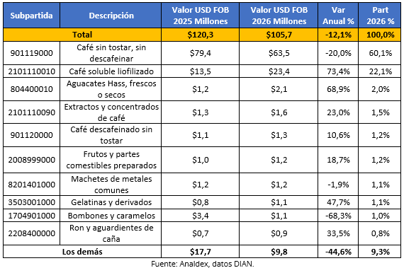Entre los principales productos que contribuyeron a este decrecimiento se destacan café sin tostar, sin descafeinar, que concentró 60,1% del total y registró una caída de 20,0%, seguido por bombones y caramelos, con una participación de 1,0% y una disminución de 68,3%. Por otra parte, algunos productos registraron crecimientos, como café soluble liofilizado, con una participación de 22,1% y un aumento de 73,4%, así como aguacates Hass con una participación de 2,0% y un aumento de 68,9%.