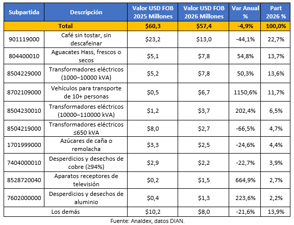 Entre los principales productos que contribuyeron a este decrecimiento se destacan café sin tostar, sin descafeinar, que concentró 22,7% del total y registró una caída de 44,1%, seguido por transformadores eléctricos de potencia ≤650 kVA, con una participación de 4,7% y una disminución de 66,5%. Por otra parte, algunos productos registraron crecimientos, como vehículos para transporte de 10 o más personas, que participaron con 11,7% y aumentaron 1150,6%, así como aguacates Hass que participaron con 13,7% y aumentaron 54,8%.