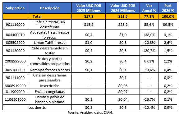 Entre los principales productos que contribuyeron a este crecimiento se destacan café sin tostar, sin descafeinar, que concentró 89,5% del total y registró un aumento de 85,6%, seguido por aguacates Hass, con una participación de 3,1% y un crecimiento de 138,0%. Por otra parte, disminuyeron las exportaciones de limón Tahití, que participaron con 2,6% del total y registraron una caída de 20,3%, así como naranjas frescas o secas (-10,6%).
