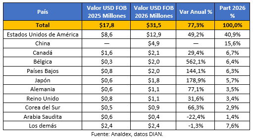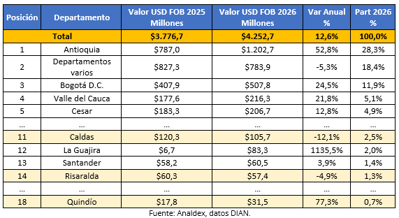 En enero de 2026, las ventas externas de Quindío alcanzaron USD FOB $31,5 millones, presentando un crecimiento en su valor de 77,3% frente al nivel del mismo mes del año anterior.