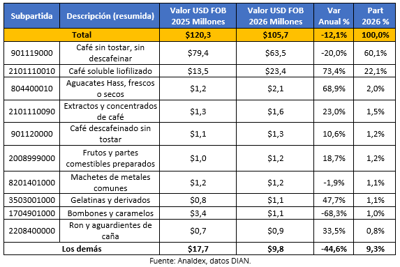 Entre los principales productos que contribuyeron a este decrecimiento se destacan café sin tostar, sin descafeinar, que concentró 60,1% del total y registró una caída de 20,0%, seguido por bombones y caramelos, con una participación de 1,0% y una disminución de 68,3%. Por otra parte, algunos productos registraron crecimientos, como café soluble liofilizado, con una participación de 22,1% y un aumento de 73,4%, así como aguacates Hass con una participación de 2,0% y un aumento de 68,9%.