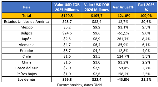 Por su parte, el peso exportado se ubicó en 16,8 miles de toneladas métricas, presentando un decrecimiento de 2,3% respecto a enero de 2025.