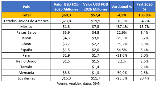Por su parte, el peso exportado se ubicó en 4,8 miles de toneladas métricas, presentando un crecimiento de 21,5% respecto a enero de 2025.