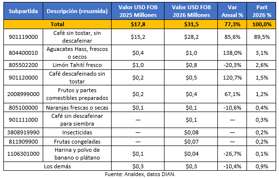 Entre los principales productos que contribuyeron a este crecimiento se destacan café sin tostar, sin descafeinar, que concentró 89,5% del total y registró un aumento de 85,6%, seguido por aguacates Hass, con una participación de 3,1% y un crecimiento de 138,0%. Por otra parte, disminuyeron las exportaciones de limón Tahití, que participaron con 2,6% del total y registraron una caída de 20,3%, así como naranjas frescas o secas (-10,6%).