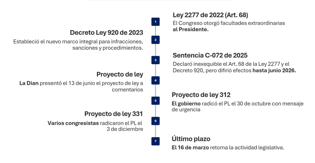 La Sentencia C-441 de 2021 puso ese problema en blanco y negro. La Corte Constitucional declaró inconstitucional el régimen sancionatorio vigente y ordenó al Congreso regularizar la situación. El mensaje era inequívoco: esta materia le pertenece al legislador. Sin embargo, el Congreso no legisló. En cambio, la Ley 2277 de 2022 (la reforma tributaria del gobierno entrante) optó por delegar de nuevo la tarea al ejecutivo, otorgando facultades extraordinarias al presidente para expedir el nuevo régimen sancionatorio mediante decreto. El gobierno las utilizó, y en junio de 2023 nació el Decreto Ley 920.