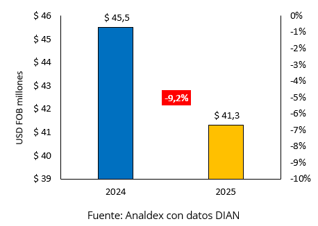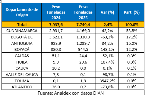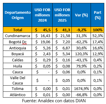 Este resultado contrasta con el comportamiento de Bogotá D.C., que pasó de USD FOB $19,06 millones a USD FOB $7,20 millones, con una caída de -62,2%, reduciendo su participación a 17,4%.