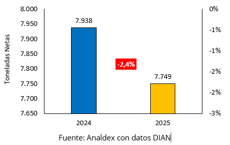 Al comparar ambas variables, se observa que el descenso del valor exportado fue más pronunciado que la disminución en el peso, lo que sugiere una reducción en el valor promedio implícito por tonelada exportada durante 2025.