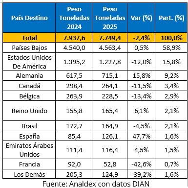 Por su parte, el peso exportado también mostró una disminución, aunque de menor magnitud que la observada en valor. En 2024, los envíos de uchuva alcanzaron 7.938 toneladas netas, mientras que en 2025 se ubicaron en 7.749 toneladas netas, con una variación de -2,4%. Lo anterior indica que, si bien el volumen exportado retrocedió, la caída fue relativamente moderada en comparación con la registrada en los ingresos por exportación.