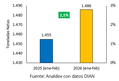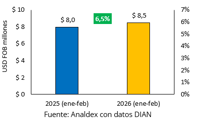 En términos de valor, las ventas externas pasaron de USD FOB $8,0 millones en enero-febrero de 2025 a USD FOB $8,5 millones en igual periodo de 2026, lo que representó un crecimiento de 6,5%. Este resultado refleja una recuperación moderada en las ventas del producto durante el arranque del año.