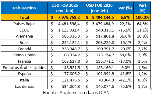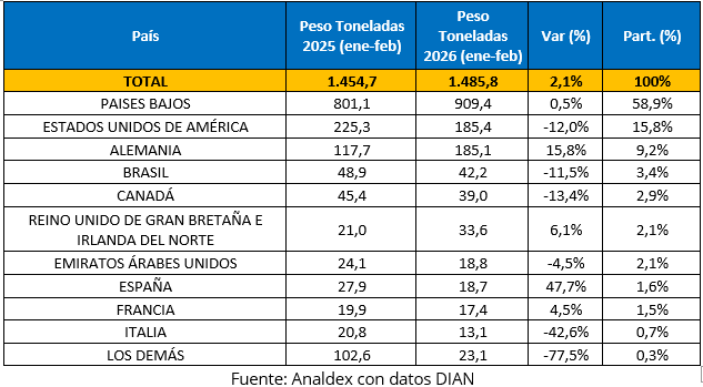 En cuanto a países destino por peso, las exportaciones de enero a febrero de 2026 mantuvieron una alta concentración en Países Bajos, que se consolidó como el principal mercado de destino con 909,4 toneladas y una participación de 58,9%.
