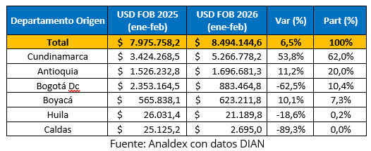 Antioquia se ubicó como el tercer principal origen, con exportaciones por USD FOB $6,87 millones y una participación de 16,6%, acompañado de un crecimiento de 30,6% frente al año anterior.