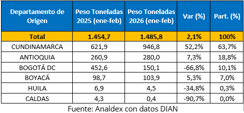 En cuanto al peso exportado por los departamentos en lo corrido del 2026, se evidencia una fuerte concentración en Cundinamarca, acumulando 946,8 toneladas de las 1.485,8 toneladas exportadas, es decir, una participación en las exportaciones en lo corrido del 2026 de 63,7%