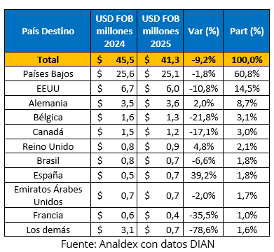 Desde la perspectiva de los mercados de destino por valor, la canasta exportadora mantuvo una alta concentración en Europa, particularmente en Países Bajos, que continuó como el principal comprador del producto. Este mercado registró exportaciones por USD FOB $25,1 millones, con una participación de 60,8% sobre el total y una leve contracción de -1,8% frente al año anterior, cuando se ubicó en USD FOB $25,6 millones.
