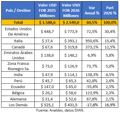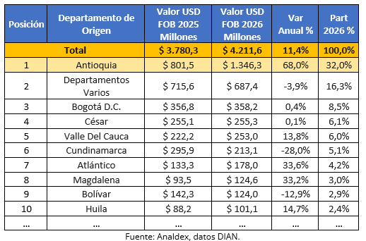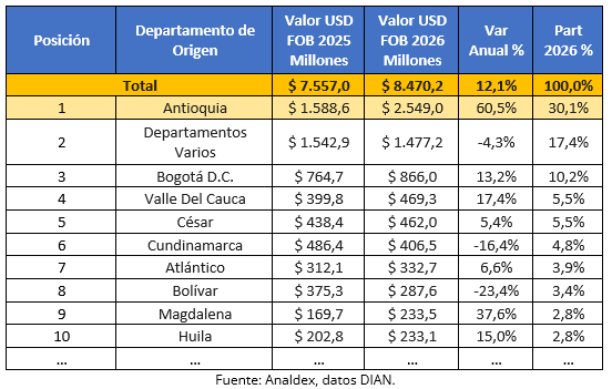 En el acumulado de 2026, las exportaciones de Antioquia alcanzaron USD FOB $2.549 millones, posicionándose también como el departamento con mayor valor exportado del país. Este resultado representó un crecimiento de 60,5% frente al mismo periodo del año anterior y una participación de 30,1% en el total nacional.