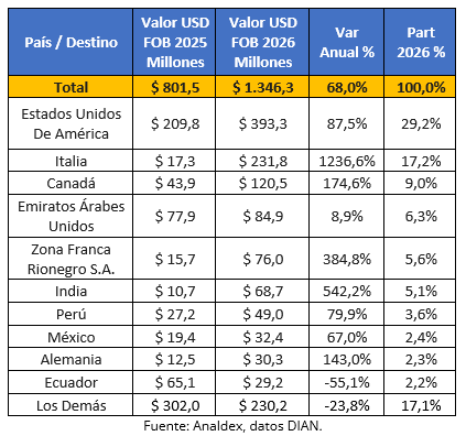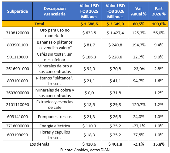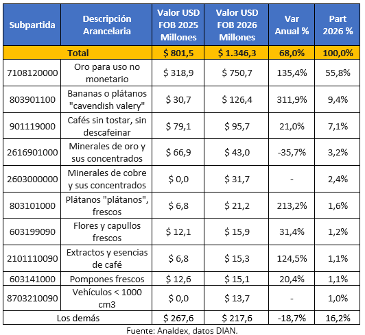 En lo corrido de 2026, los principales productos que contribuyeron a este crecimiento se destacan el oro para uso no monetario, que concentró 56,0% del total y registró un crecimiento de 125,3%, seguido por bananas o plátanos tipo cavendish, que representaron 9,4% y crecieron 194,7% y café sin tostar, con una participación de 9,0% y un aumento de 22,7%. Por su parte, disminuyeron las exportaciones de minerales de oro y sus concentrados, que participaron con 2,8% del total y registraron una caída de 23,0% y las de energía eléctrica que pasaron de USD FOB $110 millones a USD FOB $25 millones.