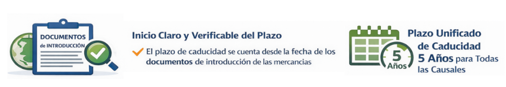 El nuevo Artículo 39 recoge ese ajuste con dos elementos. Primero, unifica el plazo en cinco años para todas las causales, eliminando la dualidad anterior que mantenía cinco años para las causales de contrabando y tres años para las demás. Segundo, para las causales generales, fija el inicio del cómputo en un criterio verificable. La redacción del inciso segundo del Artículo 39 establece que