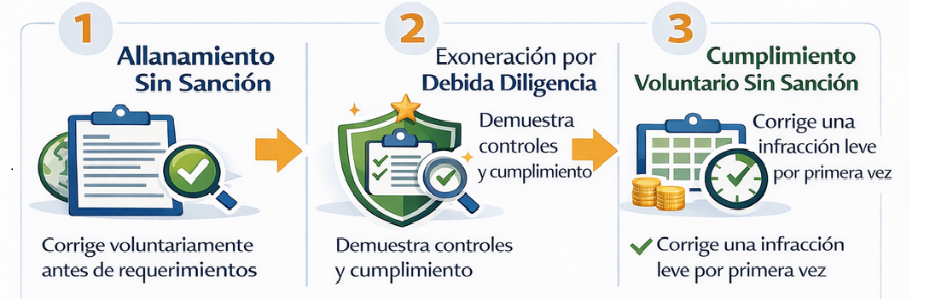 El tercero es el cumplimiento voluntario sin sanción previsto en el Parágrafo 1 del Artículo 15: quien por primera vez en tres años incurra en una infracción leve y corrija su situación no será objeto de sanción pecuniaria.