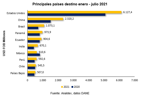 Durante el periodo de enero – julio de 2021, el principal destino de las exportaciones colombianas fue Estados Unidos. La fluctuación de las exportaciones hacia este destino fue de 20,7%, al pasar de USD FOB 5.076,2 millones en 2020 a USD FOB 6.127,4 millones en 2021. Los principales productos hacia este destino fueron: Aceites de petróleo crudos y oro no monetario. Adicionalmente los productos de mayor crecimiento son las fundiciones, hierro y acero (469,4%) y vehículos (77,9%).