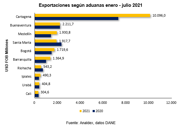 Durante el periodo de enero – julio de 2021, la principal aduana para salida de exportaciones continuó siendo Cartagena representando el 47,4% de la participación. Esta aduana presentó un crecimiento de 38,2%, al pasar de USD FOB 7.304,8 millones en 2020 a USD FOB 10.096,0 millones para 2021.