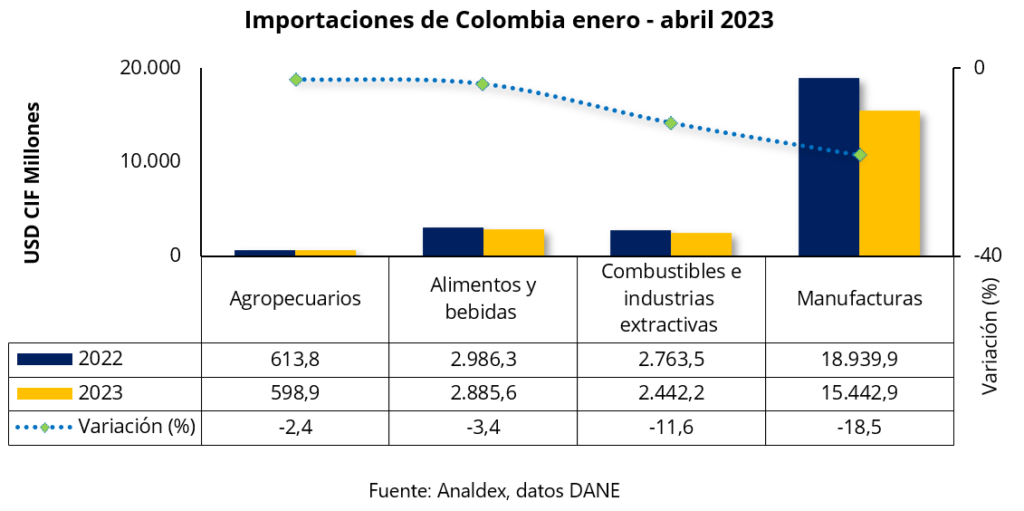 En el cuarto mes de 2023, las compras externas del país alcanzaron un valor de USD CIF 4.942,6 millones presentando un decrecimiento de 22,7% respecto al mismo mes de 2022. Este comportamiento estuvo principalmente explicado por la disminución del grupo de manufacturas que contribuyó negativamente a la variación en 16,5 puntos porcentuales, con una participación de 72,8% sobre el total de las importaciones.