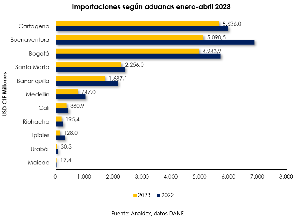 En los cuatro primeros meses del año 2023, Cartagena fue la principal aduana de ingreso de las importaciones, al representar el 26,4% del total. Se evidenció un decrecimiento de las compras al exterior por esta aduana de 5,5%, al pasar de USD CIF 5.966,7 millones a USD CIF 5.636,0 millones.